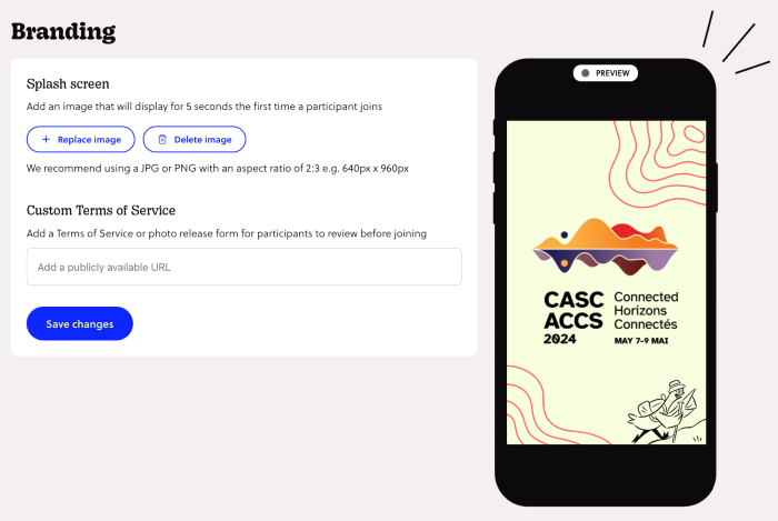 - Add a splash screen: A splash screen is a full-screen image that displays for 5 seconds the first time a participant joins your Experience. Take advantage of this space to welcome your attendees, or even offer it up as a space for sponsor logos.